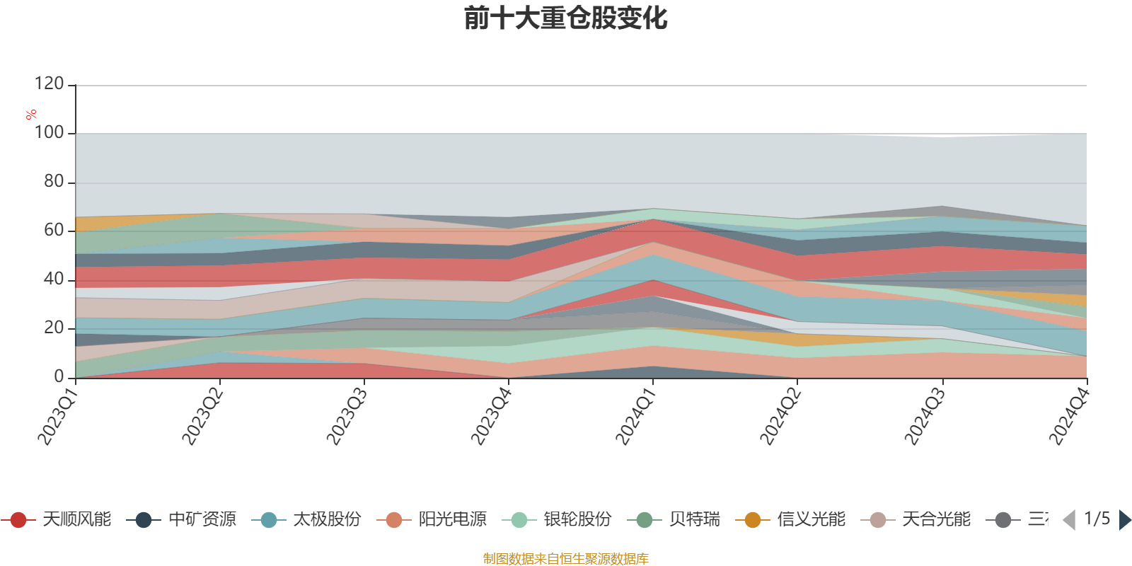 该基金持股集中度较高,近2年前十大重仓股集中度长期超过60%。截至2024年四季度末,基金十大重仓股分别是宁德时代、阳光电源、德业股份、欣旺达、亿纬锂能、璞泰来、腾讯控股、尚太科技、科达利、三星医疗。